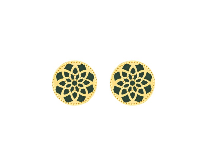 تتميز هذه الأقراط المرصعة بالجواهر بترصيعات دائرية من عرق اللؤلؤ الأخضر الزمردي، مرصعة بالذهب الأصفر عيار 18 قيراطًا. يُعزز الإطار الذهبي هذا النمط الهندسي المُتقن الصنع، مُحققًا توازنًا مثاليًا بين اللون والهيكل. يُضفي الترتيب الدقيق للعناصر الذهبية عمقًا وبُعدًا، مُجسدًا الدقة الهندسية للعمارة المقدسة.