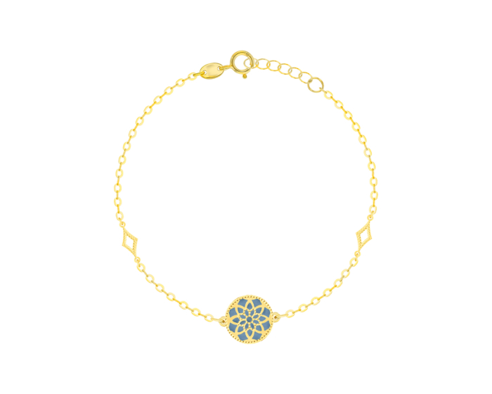 يتميز هذا السوار المصنوع من الذهب الأصفر عيار 18 قيراط بميدالية مركزية قابلة للعكس، مرصعة بعرق اللؤلؤ الأبيض من جهة، وبالأزرق السماوي من الجهة الأخرى. يُبرز العنصر المركزي نمطًا هندسيًا ذهبيًا دقيقًا يُحاكي الزخارف المعمارية لمسجد المدينة المنورة الشهير. تتضمن السلسلة أشكالًا هندسية متناسقة تُضفي تصميمًا متماسكًا على هذه القطعة الرائعة.