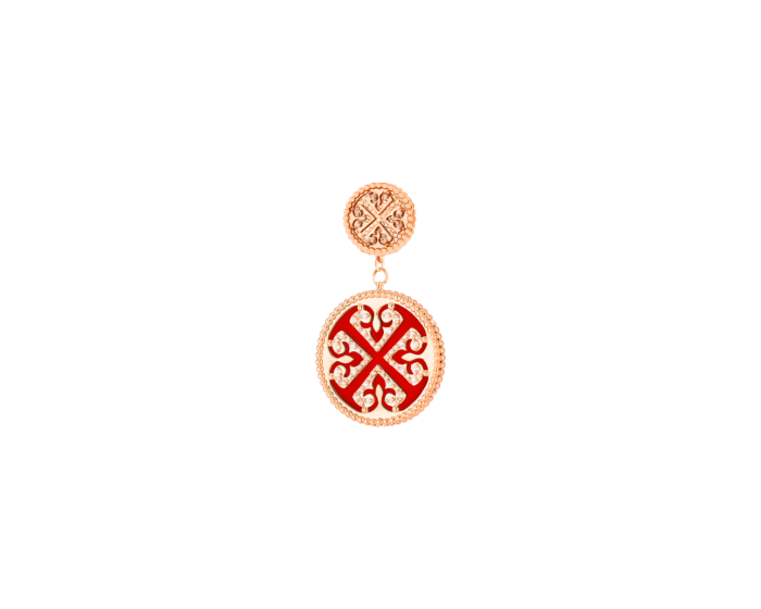 تسطع جرأة وتشرق جمالاً... تأتيكِ أقراط لايس المرصعة المصنوعة من الذهب الوردي عيار 18 قيراط بزخرفة مذهلة بفن الخط العربي تحاكي بكل إبداع أنماط فن الأرابيسك التراثي البديع التي تغطي وتتباين بصورة فائقة الجمال مع حجر العقيق الأحمر الكريم الذي يأسر القلب والعين. تسطع الميداليات البراقة والنابضة بالألوان بسحرها الذي لا يخبو مهما مر الزمن وجمالها الفتّان الذي يجسّد الرقي والأناقة والبهاء، وتتدلى بروعة من ميدالية أصغر حجماً، وتكتمل روعتها بقطع الألماس المنثورة عليها وخطوط الألماس المنضود.