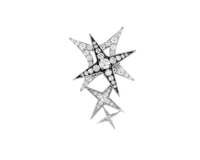 تتميز هذه الأقراط الثابتة العصرية المصنوعة من الذهب الأبيض عيار 18 قيراط بنجمتين كبيرتين متصلتين معاً وتتدلى منهما نجمتان مختلفتان الحجم لإضافة اهتمام جميل على لقطعة ولتشكيل مجموعة من النجوم المُبهرة، تستخدم الأقراط عمودًا وقفل على شكل فراشة. المجموعة تُعبّر عن السلوك الإيجابي، الذي يخلق عاطفة قوية تسمح للمرأة بِرُؤية نفسها كالنجمة وتجعل كل من حولها يشعر بإشعاعها. تم تزيين الأقراط بالألماس الأبيض عيار 0.88 قيراط ويمكن ارتداؤها في أي مناسبة لإبراز الأسلوب الفريد لكل امرأة.