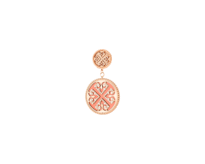 تسطع جرأة وتشرق جمالاً... تأتيكِ أقراط لايس المرصعة المصنوعة من الذهب الوردي عيار 18 قيراط بزخرفة مذهلة بفن الخط العربي تحاكي بكل إبداع أنماط فن الأرابيسك التراثي البديع التي تغطي وتتباين بصورة فائقة الجمال مع حجر الأوبال الذي يأسر القلب والعين. تسطع الميداليات البراقة والنابضة بالألوان بسحرها الذي لا يخبو مهما مر الزمن وجمالها الفتّان الذي يجسّد الرقي والأناقة والبهاء، وتتدلى بروعة من ميدالية أصغر حجماً، وتكتمل روعتها بقطع الألماس المنثورة عليها وخطوط الألماس المنضود.