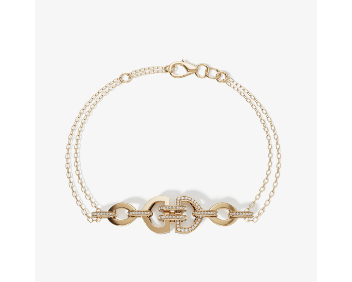 يتميز سوار "دوم" المزدوج الرائع بتصميم آرت ديكو بقطعة مركزية متألقة بنقش مزدوج على سلسلة من الذهب الأصفر عيار 18 قيراطًا. يُبرز تصميم المجموعة المميز، حيث تتألق القبة العلوية بالألماس، بينما تتألق القبة السفلية بعرق اللؤلؤ الأبيض اللامع. تربط وصلات مرصعة بالألماس بين العنصرين بدقة متناهية. يُضفي هذا السوار، المُزين بحلقات ذهبية رقيقة، أناقة خالدة، ويُضفي لمسةً أنيقةً على أي مناسبة.