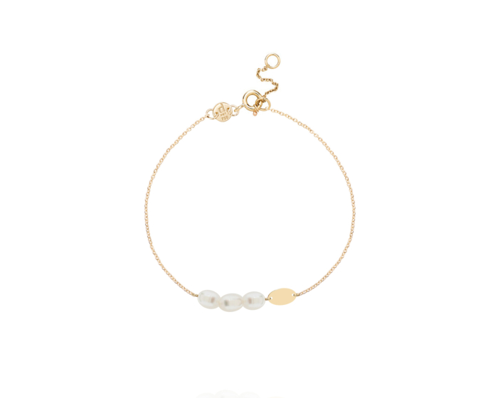 ثلاث لآلئ لامعة تتجمّع معاً بجانب قرص بيضاوي مصقول من الذهب الأصفر عيار 18 في سوار كيكو مينيمال بسلسلة رفيعة وأنيقة. هذا التكوين غير المتناظر يلفت الأنظار ويضيف لمسة جمالية لافتة على الإطار المعدني الناعم. يُجسّد التصميم العصري جمال تألّق اللؤلؤ حين يتعزّز بتفاصيل هندسية من الذهب.