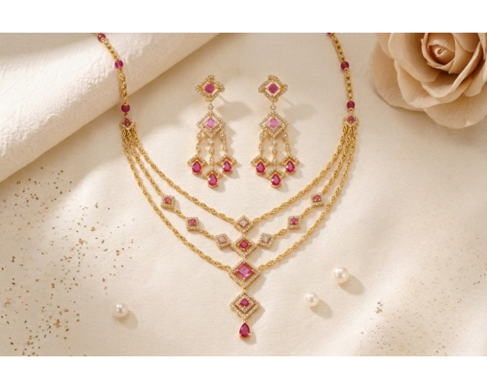 This elegant necklace set captures a premium look through its structured design, elevated stone play, and beautifully finished gold setting. Created in 22K yellow gold, this design uses Pink Tourmaline to highlight its decorative appeal and premium presence. For shoppers looking into premium necklace set jewellery, gold pieces with rich stone detailing, or standout festive accessories, this design offers a confident and elegant answer. Its craftsmanship, styling flexibility, and elevated finish make it suitable for traditional wear, occasion dressing, and meaningful gifting.