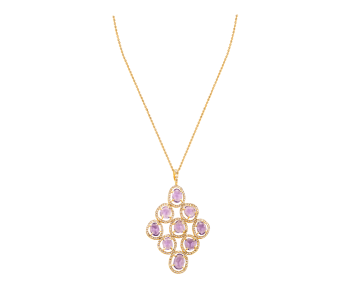 تأسر درجات اللون الأرجواني الأخّاذة للجمشت الأنظار في طقم ليجاسي هذا، المكوّن من سلسلة قلادات وأقراط متناسقة، معززًا بالألماس المتلألئ، ومرصّع بدفء بالذهب الأصفر عيار 22 قيراط. ينعكس التصميم المستوحى من التراث بتناغم في المكونات المتناسقة لهذا الطقم، مشعًا بروعة ملكية بلمسة عصرية راقية.