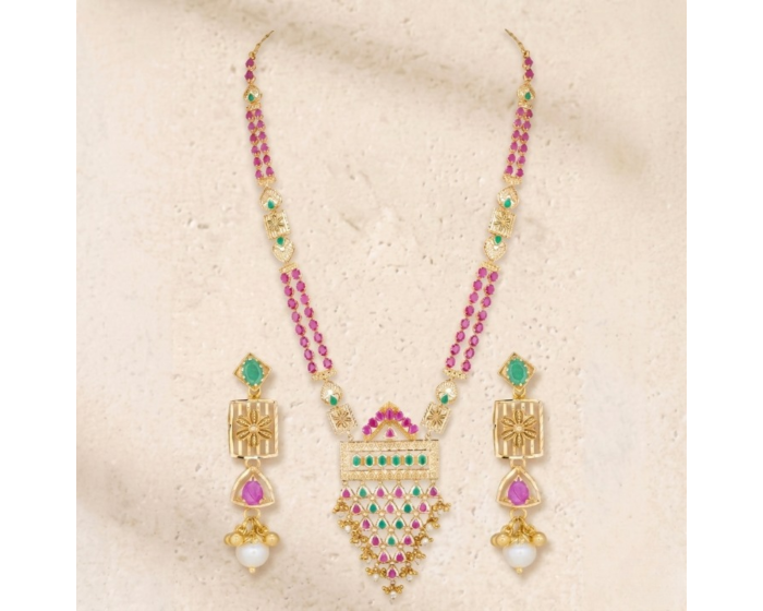 This distinctive long necklace is crafted to deliver a luxurious look through its clean proportions, expressive stones, and radiant gold finish. Set in 22K yellow gold, it is detailed with Ruby, Emerald, Pearl to give the piece a richer, more dimensional finish. For buyers researching elegant long necklace options, heirloom-inspired gemstone jewellery, or finely crafted gold styles, this design delivers visual impact with a refined finish. Its balanced proportions, luxurious materials, and versatile styling make it suitable for special events, elevated gifting, and memorable personal purchases.