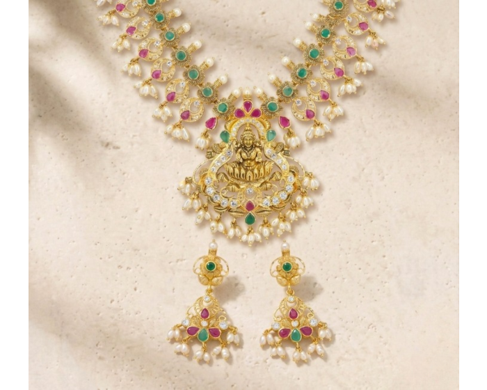 This elegant necklace set captures a premium look through its structured design, elevated stone play, and beautifully finished gold setting. Created in 22K yellow gold, this design uses Ruby, Emerald, Pearl, CZ to highlight its decorative appeal and premium presence. For shoppers looking into premium necklace set jewellery, gold pieces with rich stone detailing, or standout festive accessories, this design offers a confident and elegant answer. Its craftsmanship, styling flexibility, and elevated finish make it suitable for traditional wear, occasion dressing, and meaningful gifting.