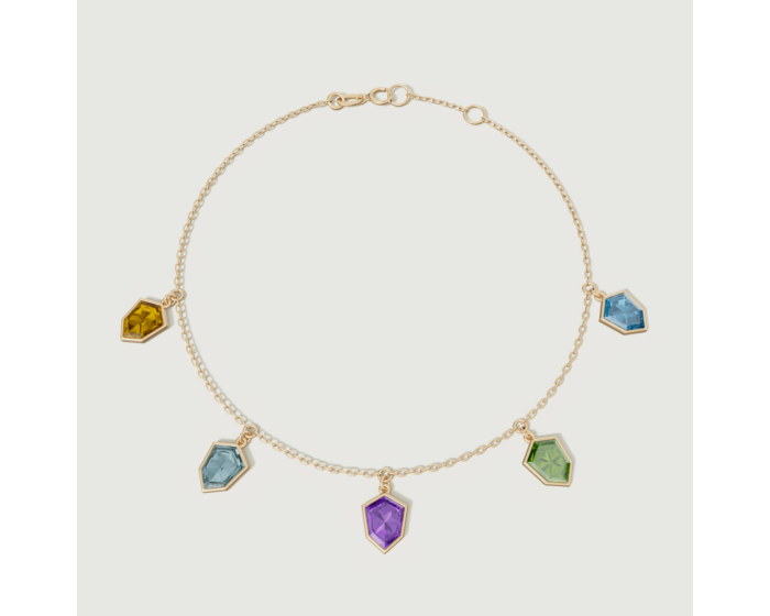 يزين هذا الخلخال المذهل المصنوع من الذهب الأصفر عيار 18 قيراطًا خمسة أحجار ملونة مقطوعة على شكل منشور - الأميثيست، والسترين، والبيريدوت، والتوباز الأزرق السويسري، والتوباز الأزرق اللندني. يضمن قفل الإغلاق القابل للتعديل المرونة، بينما تضفي الأحجار الملونة تعبيرًا حيويًا ومبهجًا. يبلغ قياس السوار 24.5 سم.