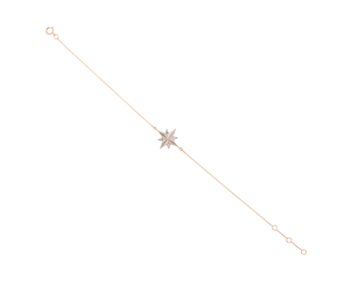 مصنوع من الذهب الوردي الدافئ عيار 18 قيراط، يعرض هذا السوار الدقيق على شكل نجمة مرصعة بالألماس ضمن السلسلة. يضيف الرمز السماوي المزخرف بالألماس بريقًا لا يُقاوم يلمع مع كل حركة. تجلب هذه القطعة الراقية جمال الكون إلى أناقة يومية متقنة.