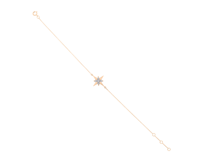 يعرض هذا السوار المصنوع من الذهب الوردي عيار 18 قيراط رمز نجمي راقٍ، حيث تضيف الألماسات تأثيرًا بصريًا متلألئًا. تتيح السلسلة الرقيقة للرمز السماوي الاستقرار بشكل جميل على الجلد مع الحفاظ على حركة رشيقة. تجسد القطعة إرشاد النجمة القطبية الأبدي في شكل يمكن ارتداؤه.