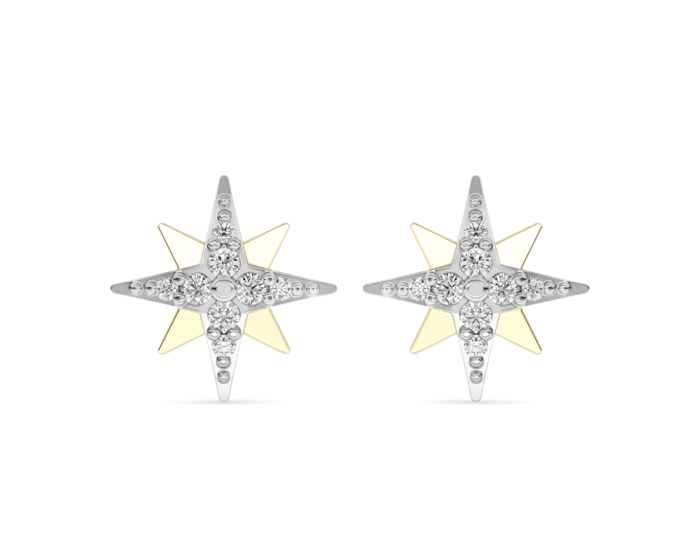مصنوعة من الذهب الأصفر عيار 18 قيراط، تتميز هذه الأقراط المسمارية بنقاط ألماس متألقة تمثل أشكال نجمية ساحرة عند الأذن. يجمع التصميم الراقي والجودة المتلألئة بين الأناقة الكونية وروعة أي مناسبة.
