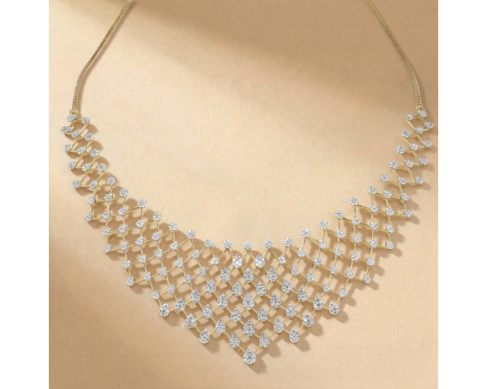 This diamond necklace in 18K gold showcases a luxurious arrangement of natural diamonds, designed for statement elegance.