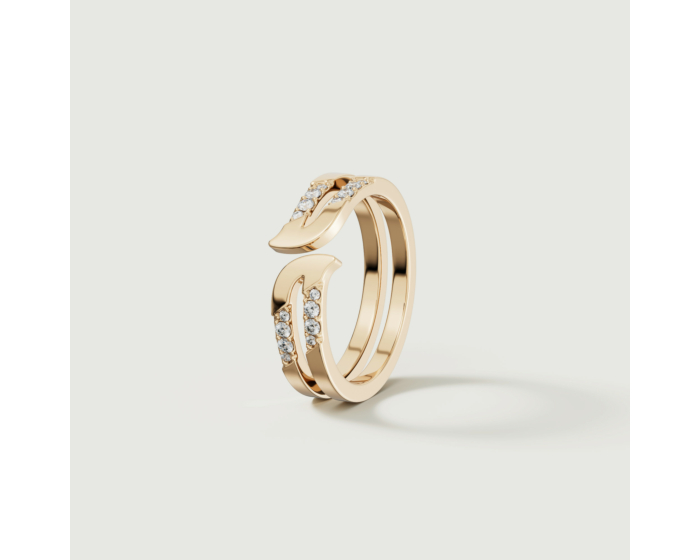 This contemporary ring features the Alif motif wrapped around the finger in 18k yellow gold with pavé-set round brilliant diamonds. The open design creates visual lightness whilst the diamond detailing adds sophisticated sparkle. Expert finishing ensures comfortable daily wear and a lasting style statement.