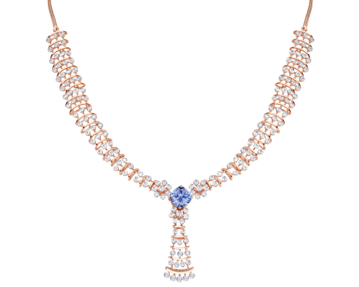 Regal splendour shines in this Ananya set of matching necklace and earrings. The design features diamonds and tanzanite, transforming the 18k rose gold setting into a mesmerising symphony of light and colour. Intricate diamond-studded strands frame the deep blue-violet tanzanite, creating a design that captures the essence of sophisticated elegance and celestial beauty.