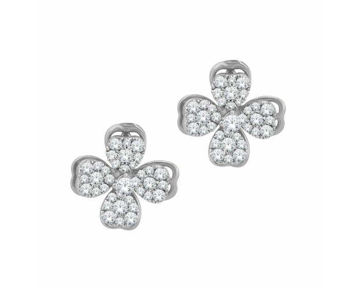 These Ananya Alyssa earrings showcase the collection's signature jasmine design, where each bloom is meticulously crafted from diamond clusters. The geometric precision creates a modern interpretation of the jasmine flower, with each triangular section set with diamonds that catch light from multiple angles. Set against lustrous 18kt white gold, these statement studs work beautifully for both daytime elegance and evening sophistication.