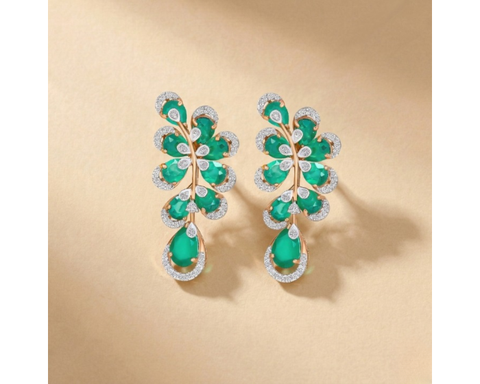 These earrings feature green onyx stones set in 18K gold, enhanced with natural diamonds. The design emphasizes elegance and movement, making them ideal for festive and evening wear.