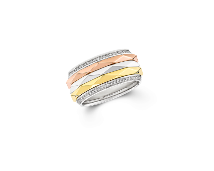 A graphic, kinetic design featuring three faceted white gold bands that rotate independently of each other, our Laurence Graff Signature triple spinning band is a contemporary classic. llluminated with pavé diamonds, the angular silhouette of the bands is a striking interpretation of the facets of a diamond - a stone that is synonymous with the House of Graff. Jewels in the Laurence Graff Signature collection range from sleek and stackable bangles and stylish hoop earrings to playful pendants and rings designed to whirl upon the finger.