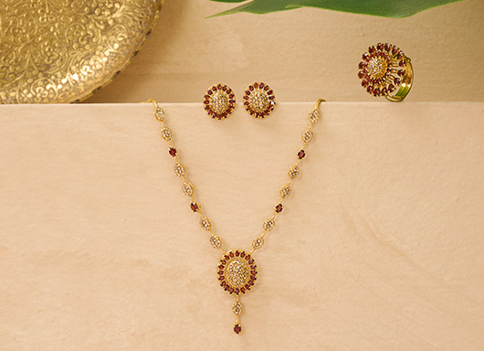 Ananya presents a unique set of jewellery with its delicate intricacies and stunning arrangement of diamonds. It is a masterpiece of distinguished classy jewellery for grand events, festivals and weddings.