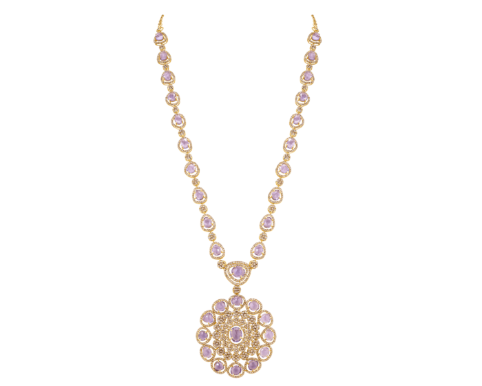 A mesmerizing adornment, this Legacy set of matching necklace and earrings showcases the regal hues of amethyst and eternal sparkle of diamonds set in the impeccable lustre of 22k yellow gold. The Mughal-inspired design also pays tribute to Middle Eastern elegance, creating a statement ensemble worthy of the most prestigious of occasions.