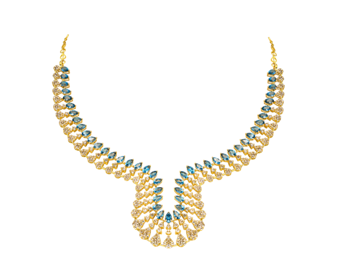 Oceanic blue topaz and fiery diamonds intertwine in this dazzling Legacy ensemble of matching necklace and earrings. The craftsmanship pays tribute to heritage-inspired regal jewels, reimagined for today’s luxury connoisseur.