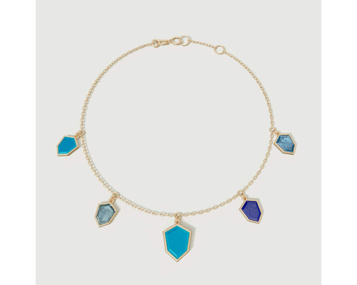 Four prism-cut stones, each featuring serene blue hues – from Swiss blue topaz and London blue topaz to lapis lazuli and turquoise - dangle gracefully from this 18k yellow gold anklet. The adjustable closure ensures a comfortable fit, making this 24.5cm anklet a perfect accessory for any occasion.