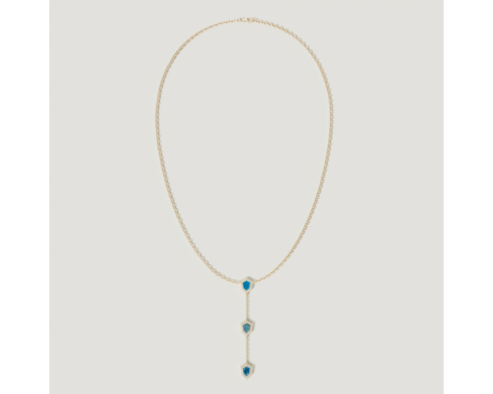 Three vibrant blue semi-precious stones, each surrounded by diamonds, form a captivating focal point as they descend from an 18k yellow gold chain. This elegant design blends the rich history of the Arabian rosette with a modern touch of sparkle, while the unique prism cut stones makes this an adornment in a class of its own. The chain measures 45cm and is a versatile addition to any look.