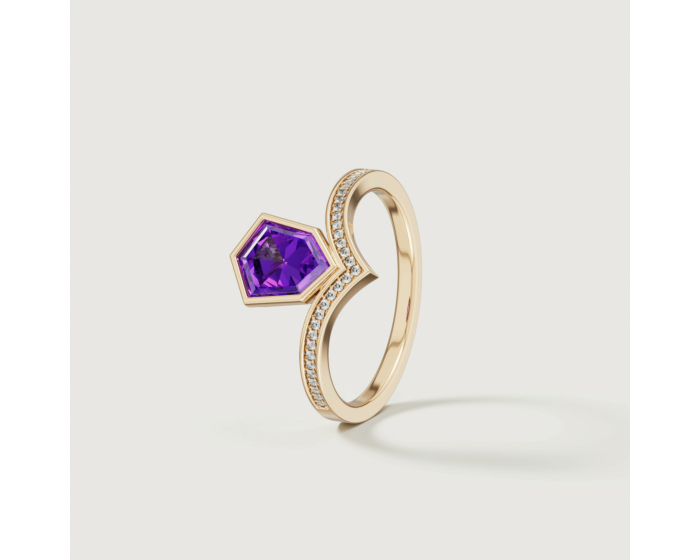 A radiant amethyst, prism-cut to perfection, sits as the centrepiece of this 18k yellow gold ring, accompanied by shimmering diamonds. The bold purple hue and sparkling diamonds create a luxurious statement as joyful as it is timeless.