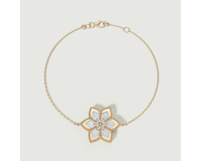 White mother-of-pearl blooms within an 18k yellow gold setting in this elegant bracelet statement motif, suspended on a fine chain. Round brilliant-cut diamonds form a luminous centre point, whilst premium Italian craftsmanship brings depth to the dimensional petal arrangement whose shiny gold finish reflects light with every gesture.
