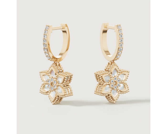 Diamond-pavé bars cascade into Stella D’oro motif drops where white mother-of-pearl petals are embraced by 18k yellow gold frames. At the heart of each bloom, a cluster of round brilliant-cut diamonds radiates light. Crafted in Italy with exceptional skill, the stunning design captures the luminous beauty of a garden reborn at dawn.