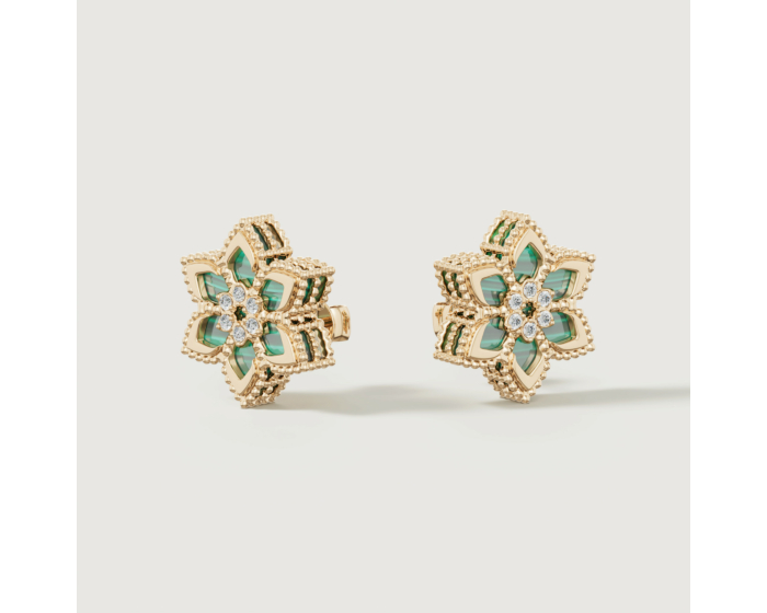 Green malachite inlays create bold contrast within these 18k yellow gold stud earrings, where six petals surround a sparkling cluster of round brilliant-cut diamonds. The shiny gold finish, intricate beaded borders, and refined Italian craftsmanship ensure these earrings capture the vibrant essence of nature reborn at dawn.