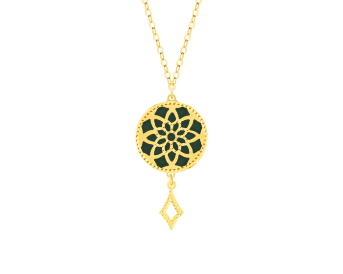 قلادة أميليا مدينة من الذهب الأصفر عيار 18 قيراط مع تعليقة من عرق اللؤلؤ الأخضر والأبيض