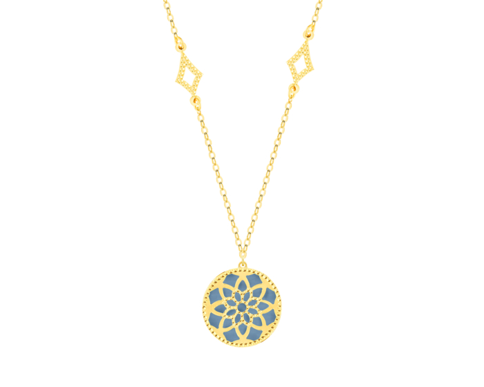 عقد أنيق من الذهب الأصفر عيار ١٨ قيراط، يتميز بميدالية مزدوجة الجوانب، مرصعة بعرق اللؤلؤ الأبيض من جهة، وأزرق سماوي هادئ من جهة أخرى. تتميز الميدالية بنقش ذهبي متقن الصنع، يُضفي تباينًا رائعًا على الخلفية المضيئة. يُكمل التصميم حلية هندسية أنيقة، مُعلقة على سلسلة مع عناصر معمارية مذهلة.