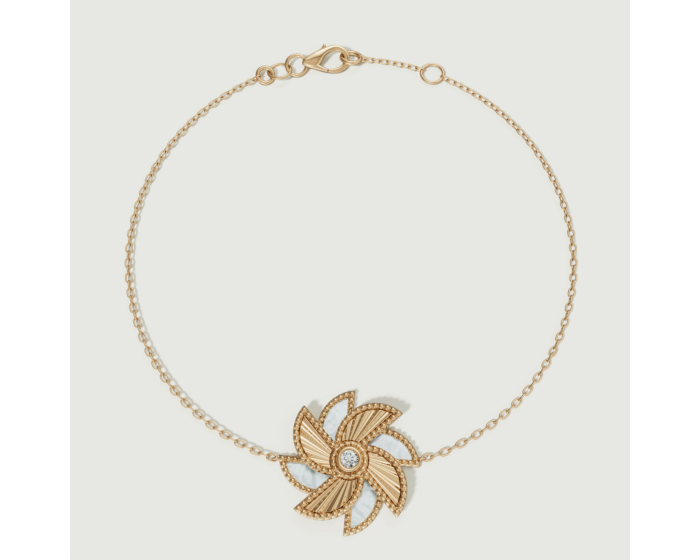 تتجسّد الحياة في حركتها الجميلة من خلال بتلات عرق اللؤلؤ الأبيض التي تتناوب مع الذهب الأصفر المطوي عيار 18 قيراط في هذا التصميم البهي على هيئة دوّارة الهواء. يتوسط التصميم ماسة متألقة احتفاءً بتألّق الأنوثة وإشراقتها. ويُكمل السلسال الرفيع هذه القطعة المعبرة برقة وأناقة، لتكون مثالية لإطلالة يومية تنبض بالأنوثة والبهجة.