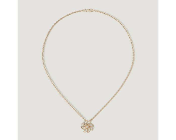 يُشكّل الذهب الأصفر عيار 18 قيراط المُصاغ بدقة إطار هذه القلادة، مع بتلات مُخرمة على شكل دائري رقيق ومبهج. يحتفي التصميم بالأنوثة المُشرقة التي تُعزّزها لمسة الألماس المركزية. تُقدّم هذه القطعة اللافتة للنظر أناقةً مُتعددة الاستخدامات، مُناسبة لجميع المناسبات.