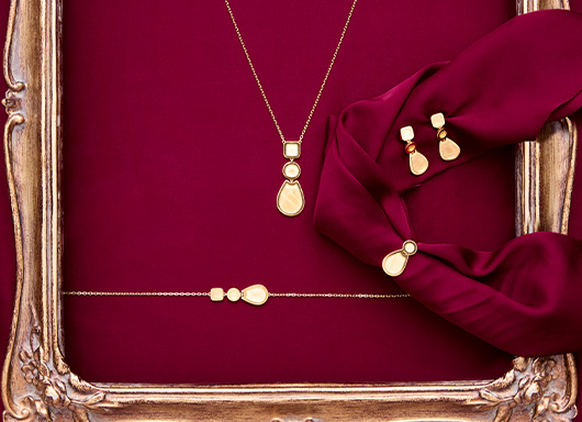 Gold jewellery with stunning arrangement of gold beads and discs that will add a remarkable glow to your ethnic attire. All the music that you need, this festive season. Shiny sparkles…it is all in the spin. Harmony collection is inspired by the magnificent world of fantasy and magic, The designs refer to human desires and emotions.