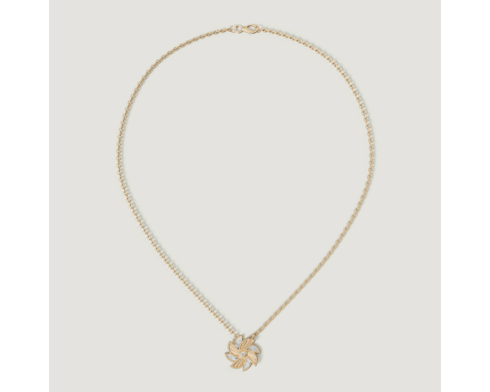 تنبض هذه القلادة ببهجة نابضة، حيث تجمع بين بتلات متناوبة من الذهب الأصفر عيار 18 قيراط وعرق اللؤلؤ الأبيض اللامع على شكل تصميم دوّارة الهواء أنيق. يلتقط عرق اللؤلؤ الضوء بدرجات ناعمة وأنثوية، فيما تمنح الماسة المتربعة في المركز بريقًا متلألئًا. تضفي التفاصيل المطوية على بتلات الذهب إحساسًا بالحركة، مع حرفية رفيعة تنبض بقوة رقيقة وجمال متألق.