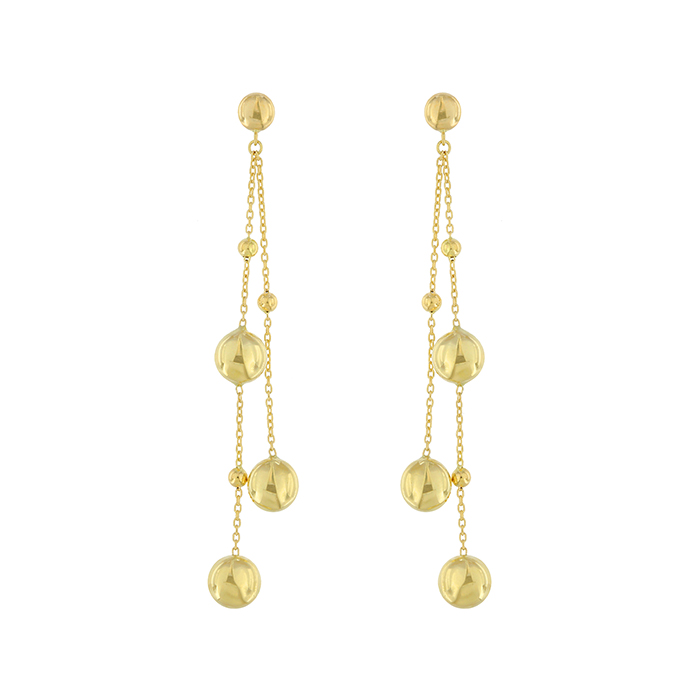 Elevate your look with this pair of Moda Elegance earrings. Featuring dangle drops with a captivating solid organic shape motif suspended from a trio of delicate chains, these earrings are crafted from 18k yellow gold. Their elegant design and fluid movement offer a perfect blend of sophistication and contemporary style, making them a versatile addition to any jewellery collection.