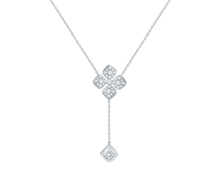 This 18k white gold necklace captures a timeless jasmine bloom adorned with dazzling diamonds. The graceful floral motif set on a finely crafted chain is accented with a delicate diamond-set drop, making a dazzling adornment that elevates any look impeccable style.