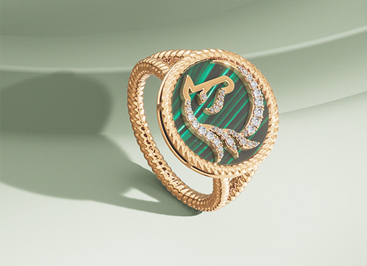Crafted in 18k gold with malachite and diamonds, the collection feels airy yet intentional. Limited high jewellery designs in white gold and diamonds, accented with sapphires, elevate the motif into a more luminous expression.