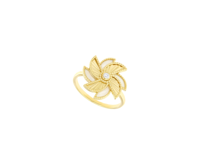 Farfasha Bliss captures the beauty of life in motion, inspired by the playful pinwheel, a symbol of happiness and joy. Each creation blossoms around a luminous diamond, with delicate mother of pearl petals that shimmer in soft hues of colour, playful yet profoundly feminine.
