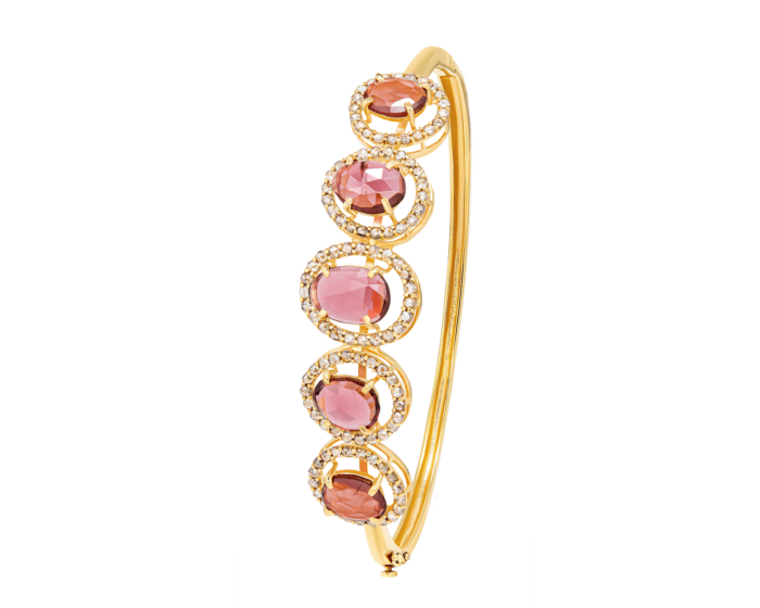يُضفي العقيق الأحمر الداكن، المُرصّع بالألماس المتألق، لمسةً ساحرةً على سوار ليجاسي هذا. تُضفي حرفية الذهب عيار 22 قيراطًا، المُتقنة، خلفيةً مُشرقةً لهذه الأحجار النابضة بالحياة، مُشيدةً بتقاليد المجوهرات العريقة في الهند والشرق الأوسط، برؤية جديدة تُناسب المرأة العصرية.