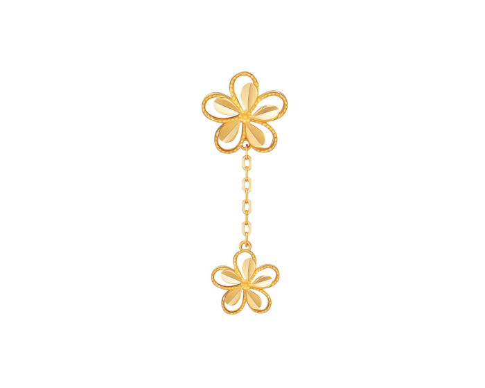 Indulge in the timeless elegance of this pair of Anmol Floret drop earrings. Inspired by life's treasures, each golden blossom is crafted from radiant 21K gold, symbolising nature's duality and your unique essence. Let these exquisite pieces adorn your ears as a reflection of your inner beauty and strength.