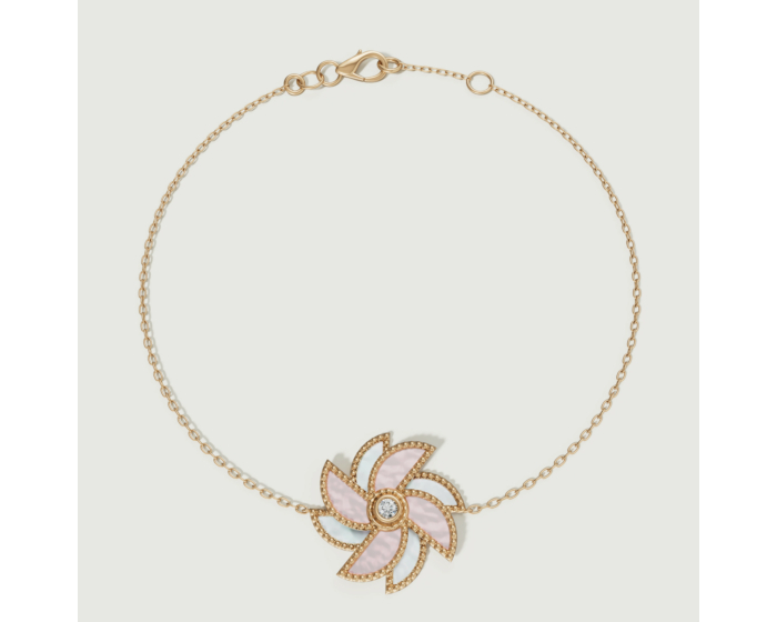 Gentle hues of pink and white mother of pearl alternate within this bracelet's 18k yellow gold pinwheel motif, capturing happiness in bloom. The delicate colour combination evokes soft, playful beauty, enhanced by expert craftsmanship. A luminous diamond at the centre adds subtle brilliance to this blissfully expressive piece.