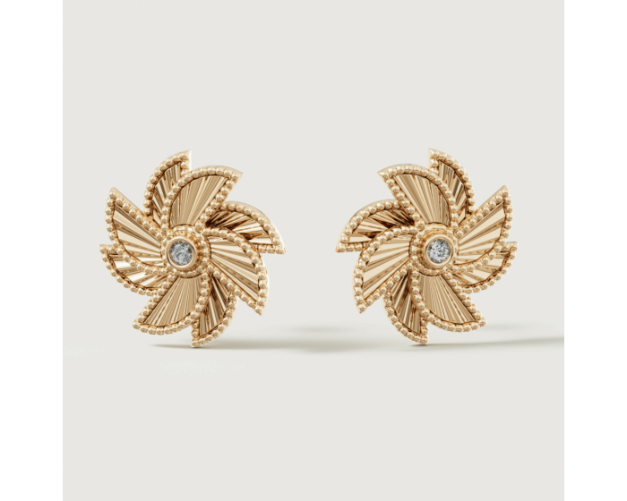 These stud earrings embody radiant femininity with their signature pinwheel motif rendered in 18k yellow gold with exquisite pleated design. Each petal spirals from a diamond centre, capturing the beauty of life in motion. The refined craftsmanship ensures these joyful adornments catch light from every angle.