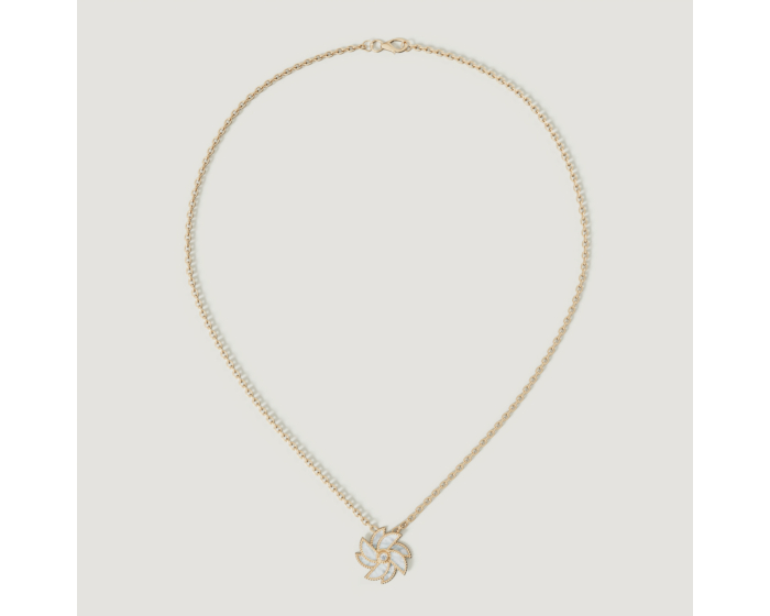 A whimsical pinwheel design rendered in 18k yellow gold creates a joyfully airy aesthetic in this pendant necklace. White mother of pearl petals shimmer with luminous radiance against the gold framework, whilst a central diamond completes this blissfully expressive piece that celebrates femininity in bloom.