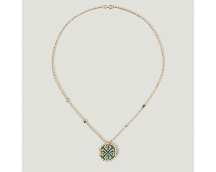 Lace necklace with Malachite gemstone pendant made of engraved 18 karat yellow gold, this necklace was creatively designed and inspired by the Arabic archeticture of artistic decoration that consists of overlapping geomorphic patterns. Therefore, each commentary finds details and inscriptions intertwined together as if it were a finely drawn painting. The 15 mm pendant is made of fine yellow gold featuring the Lace pattern of textured and hammered gold while the pattern grooves are skillfully filled with malachite stone known for its beautiful rich green colour and its absorption of negative energies enhancing well-being. The pendant is surrounded along the pendant chain by exquisite 0.28 carat diamond and emerald inlays. The necklace measures at 17 inches long.