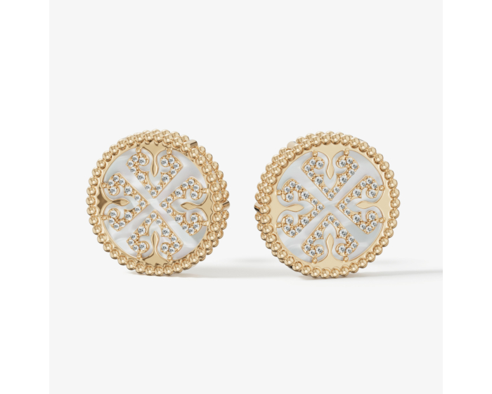 Featuring stud earrings design with a 15 mm motif made with mother of pearl the material from which pearls are composed know for its gemstone and studded with diamonds, these earrings use textured, hammered gold while the grooves are skillfully filled with turquoise gemstone known for its healing power helping with emotional balance and harmony and its visual irrestiblity due to its light reflective surface that emitts multicoloured irredicence, all while beauiful 0.29 carats diamond embellishments elevate the design. These earrings use post and butterfly weariblity. Lace collection features delicate patterns that resemble artistic paintings that draw inspiration from the Arabic architecture with lacelike insertions illustrated by interwoven geometric silhouettes.