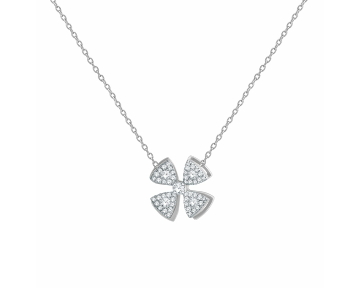 Inspired by the delicate grace of jasmine, this Ananya Alyssa pendant necklace in 18k white gold features a central blossom with a quartet of diamond-set petals on a finely crafted chain. A luminous expression of elegance, each facet of the jasmine blossom catches the light, echoing nature’s effortless beauty in a timeless design.