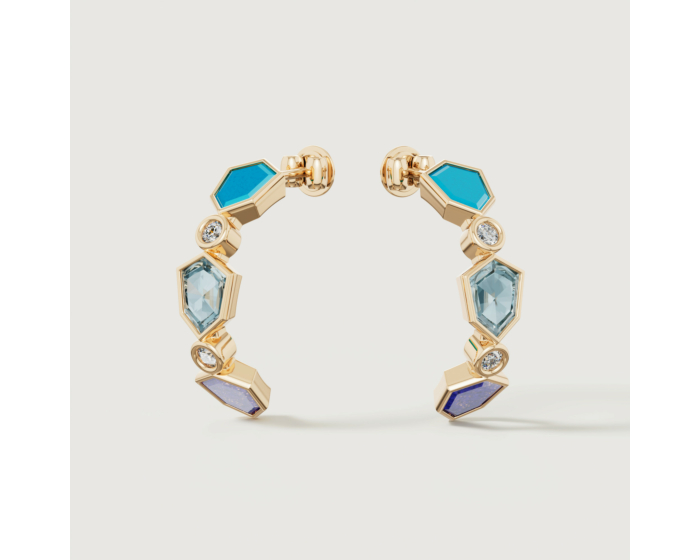 These stunning curved earrings feature prism-cut turquoise, blue topaz and lapis lazuli, interspersed with round diamonds, all set in 18k yellow gold. The fluid design and calming blue hues create a striking yet serene look, perfect for adding elegance to any occasion.