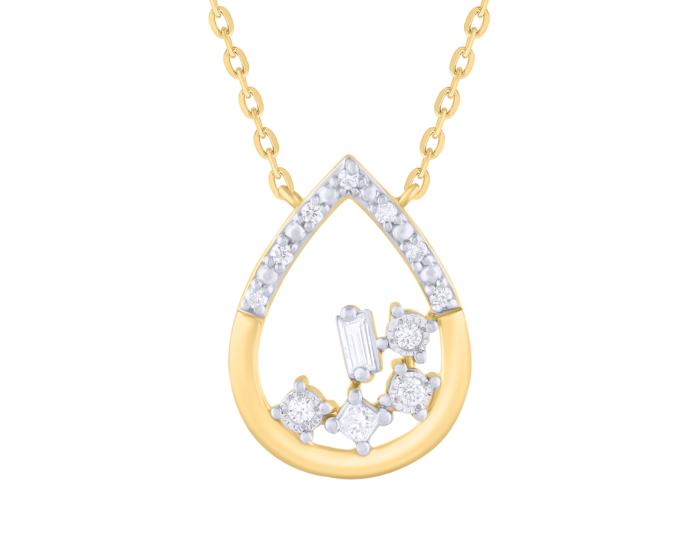 Reminiscent of a cosmic teardrop, this 18k gold necklace features a pear-shaped pendant that captures the essence of stellar beauty. The open design showcases a cluster of diamonds that appear to float within the silhouette like stars suspended in the night sky. Additional diamonds trace the upper curve, creating a perfect frame that enhances the brilliance of the central stones. Suspended from a beautifully crafted gold chain, this necklace transforms its wearer into a carrier of constellations, bringing the mystery and wonder of the cosmos to everyday elegance.